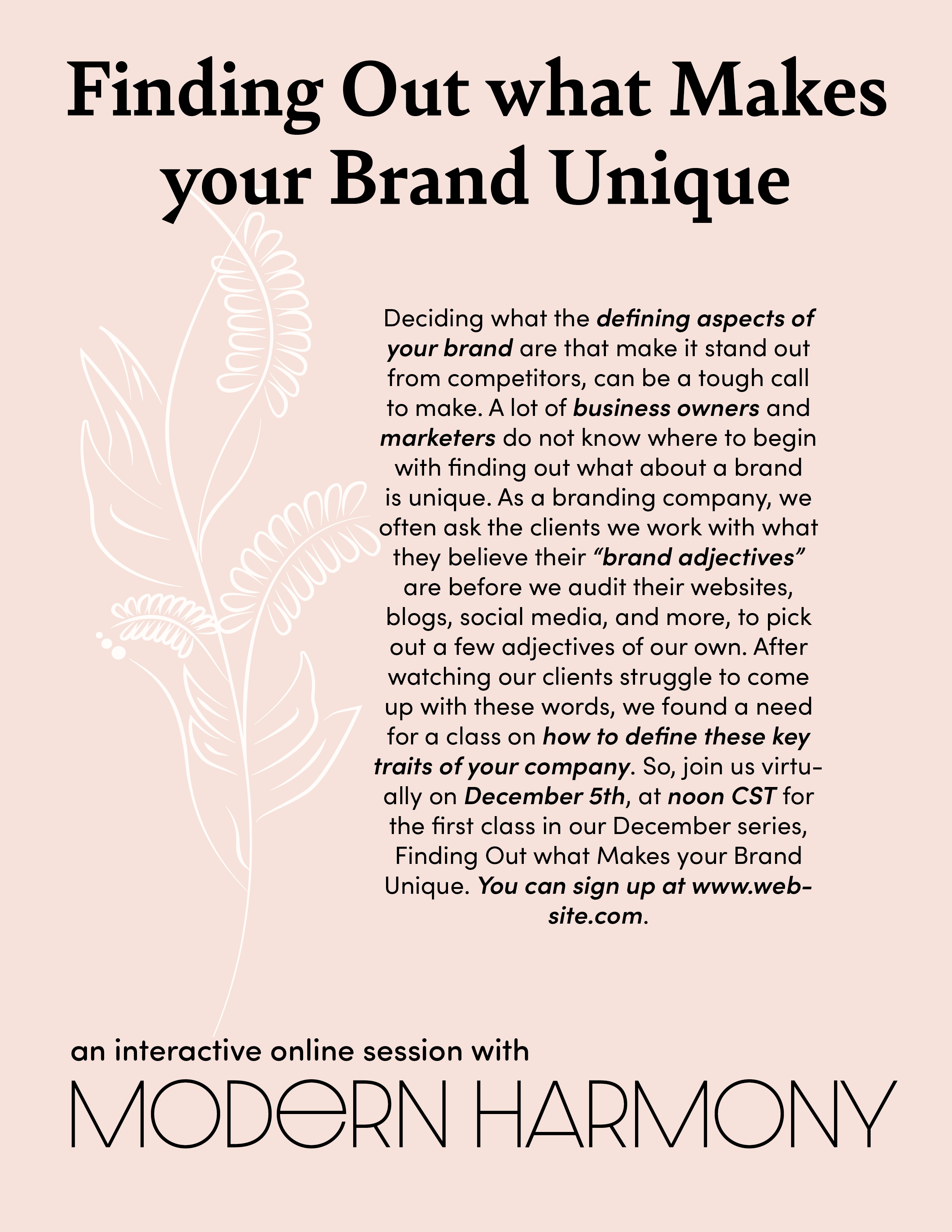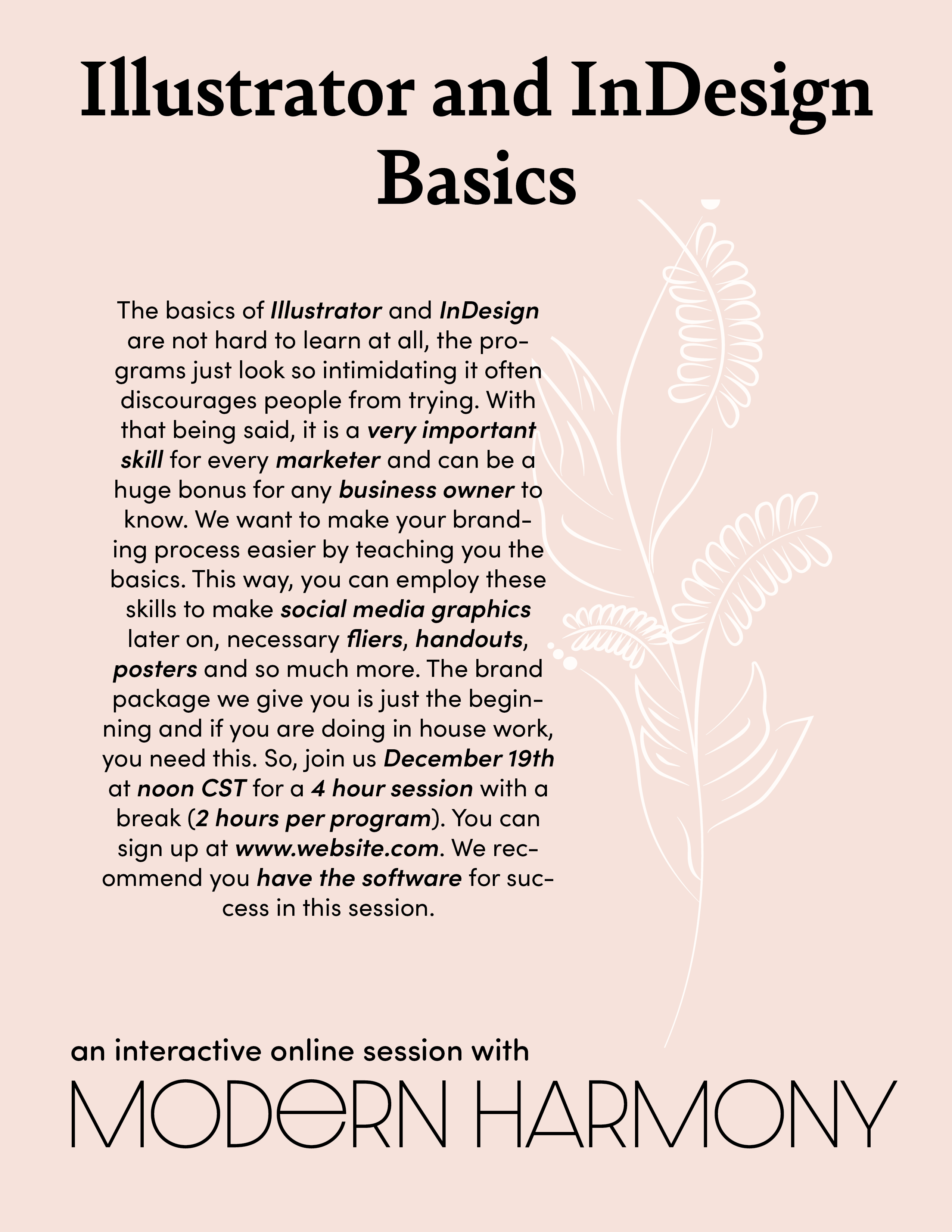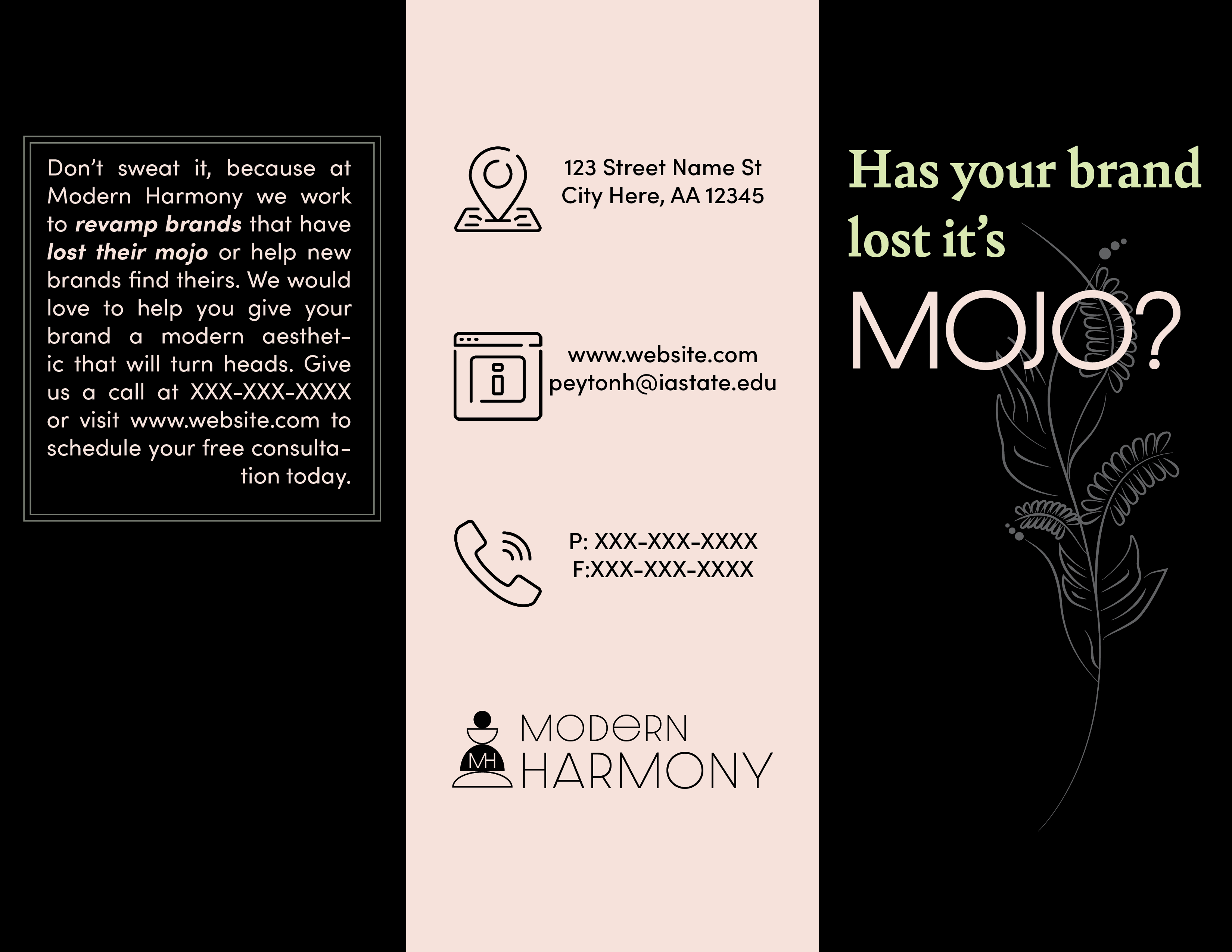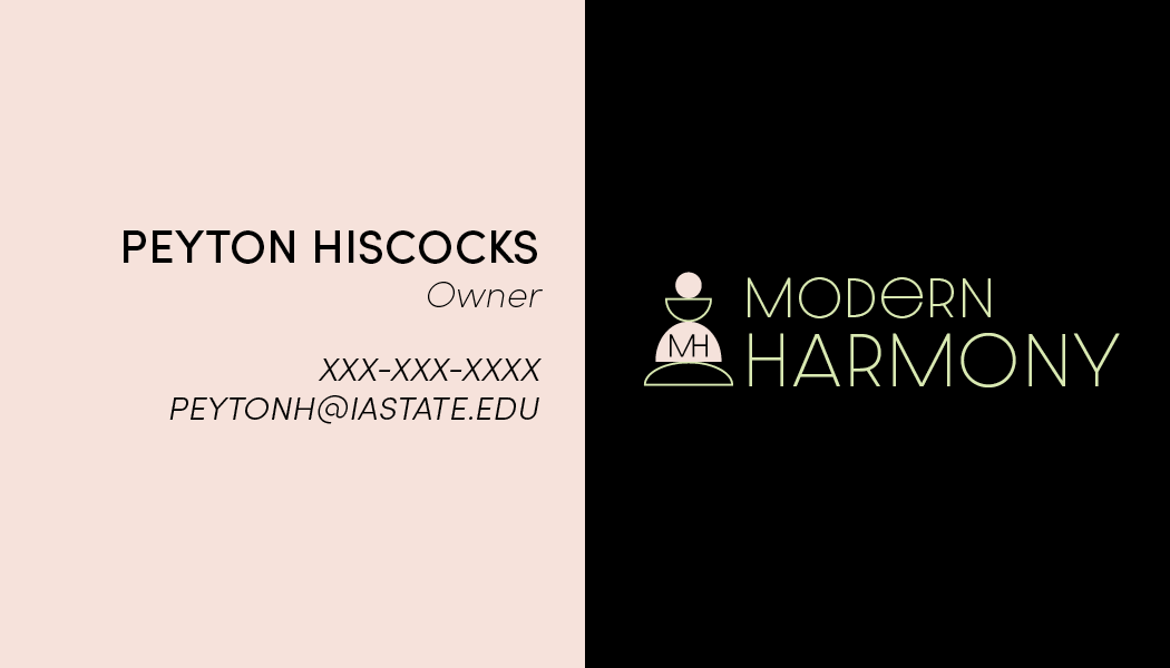 This project was completely as a part of one of my classes, Introduction to Digital Publishing. The task for the project was to invent your own company and then create a full brand package for it. I ironically created a branding agency, Modern Harmony. The package includes a logo, business card, envelope, stationary, flyers and a brochure. I also picked out the colors and fonts for the brand.
